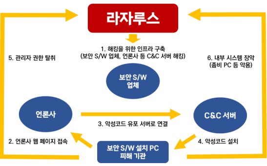 라자루스의 해킹 기법은 매우 체계적이며, 그들의 공격 과정은 다음과 같은 흐름으로 진행됩니다